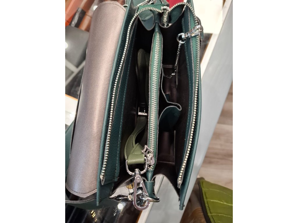 Kabelka má jednu hlavní kapsu dělenou uprostřed přepážkou, uzavřenou zipem a klopou na magnetické druky. Uvnitř postranní kapsy. Jedna kapsa na zip z vnější zadní strany.