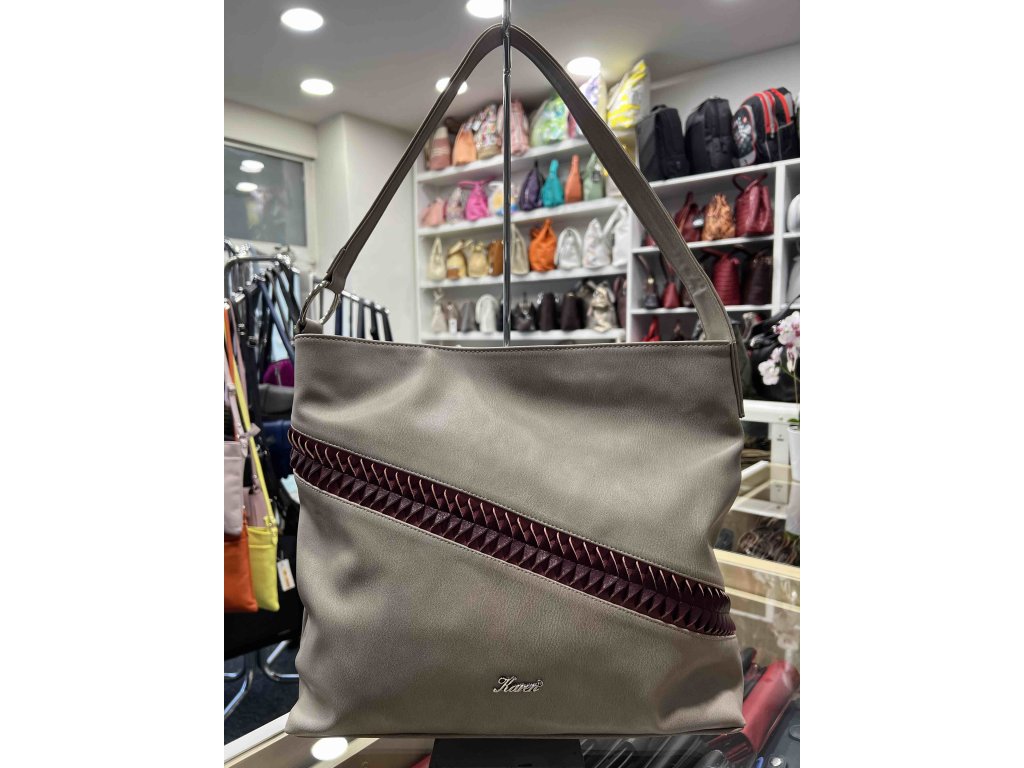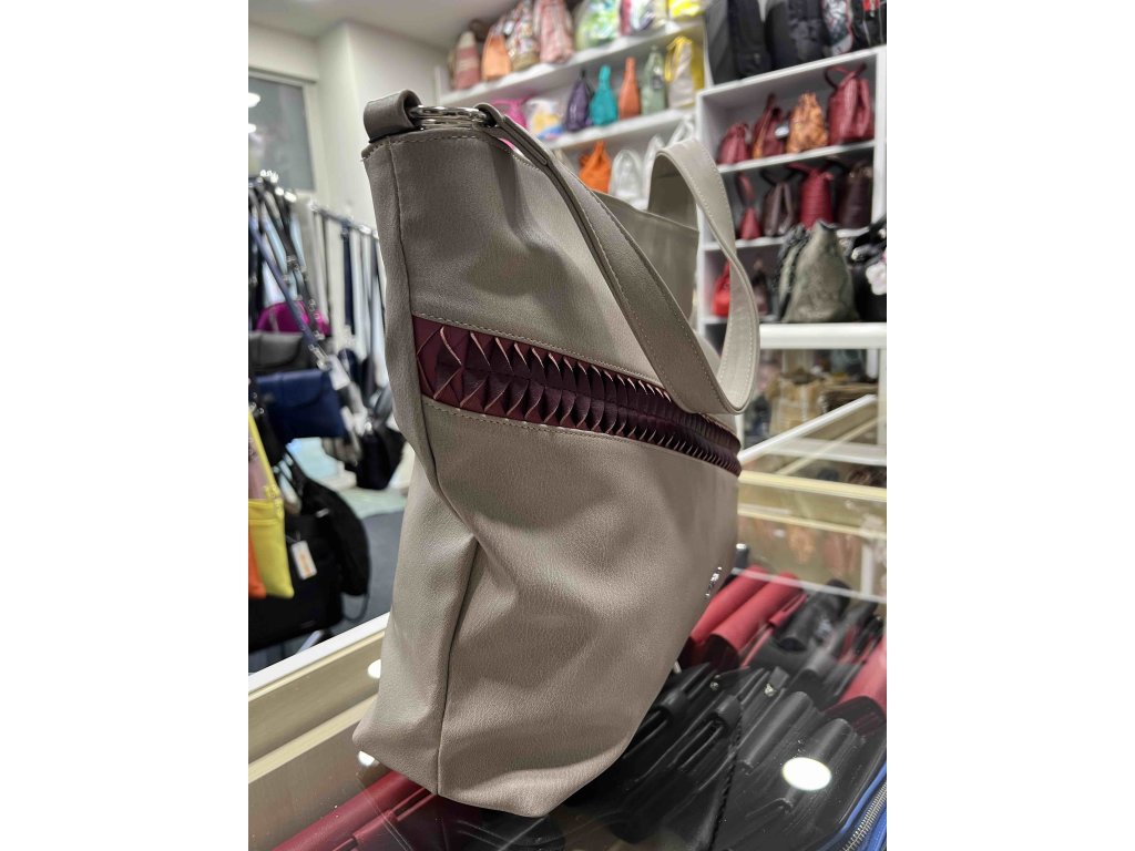 Dámská kabelka Karen Irena ve světle hnědé/ taupe barvě s vínovým detailem