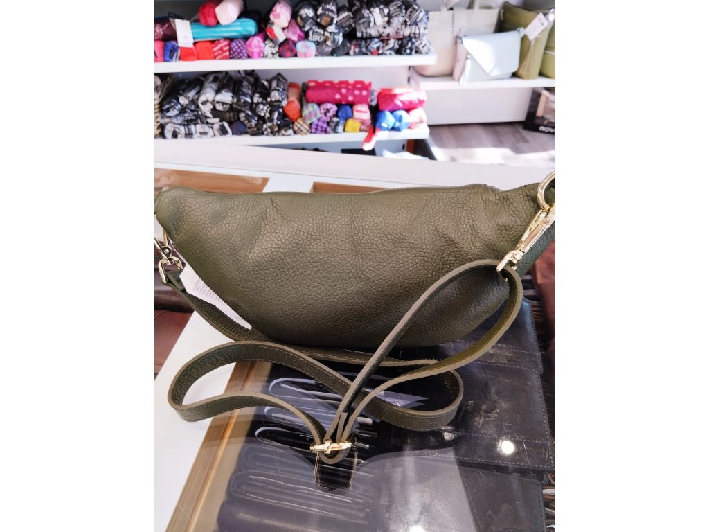 Kožená dámská crossbody ledvinka se zlatými doplňky v zelené barvě