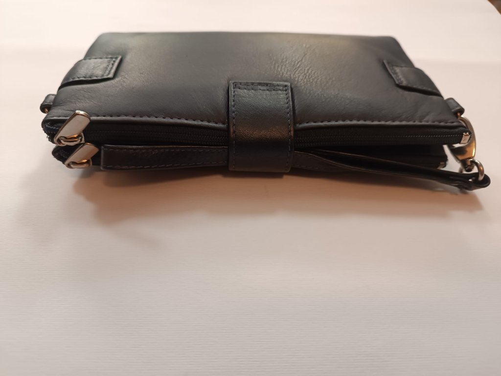 Uspořádání na karty, dvě velké přihrádky na zip, přihrádky na papírové bankovky, telefon.