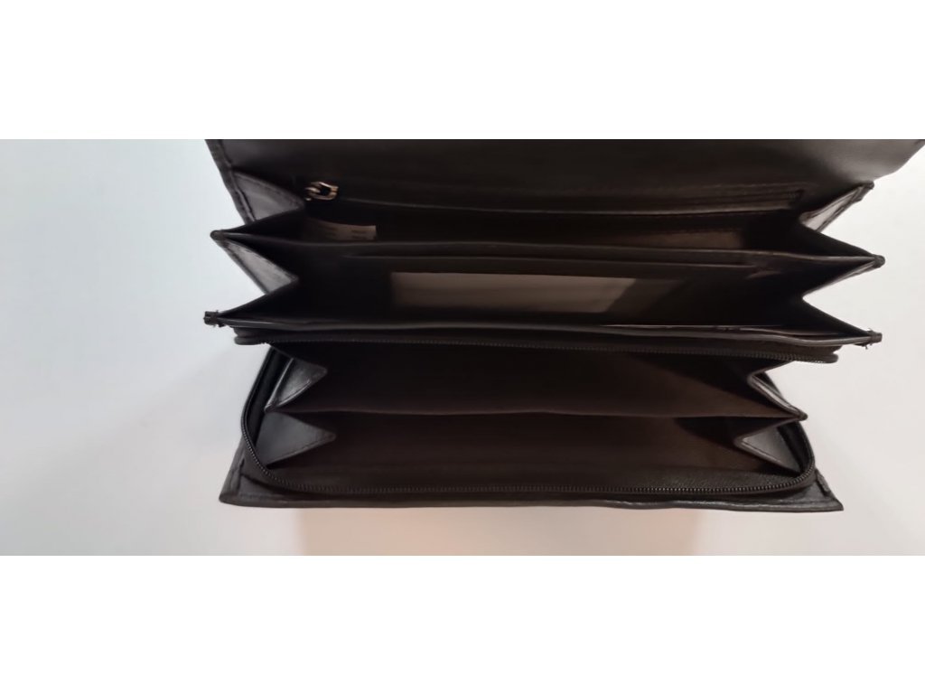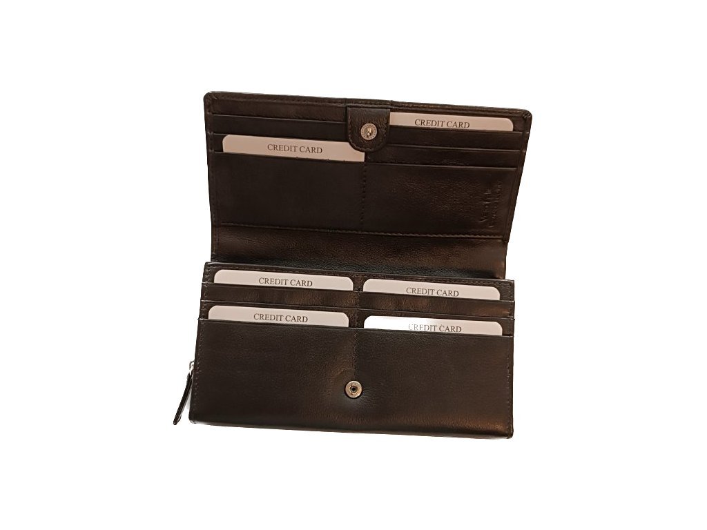 Uspořádání na karty, dostatečně velká rozdělená kapsa na drobné mince, dvě přihrádky na papírové bankovky.