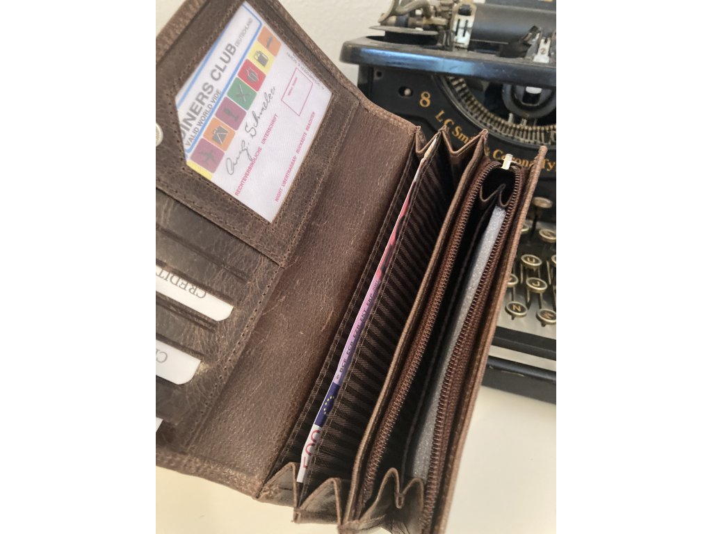 Dvě přihrádky na papírové bankovky, zipová kapsa na drobné mince.