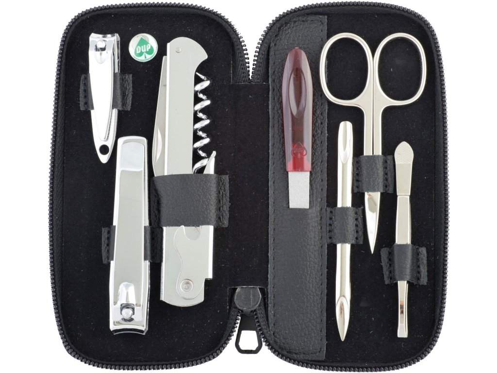 Pánská manikúra vyrobená z černé kůže obsahuje manikúrní náčiní značky DUP a Solingen. Uzavírá se zipem a je vhodná pro všechny pány. Rozměry: 14,5x8,5 x 2 cm.