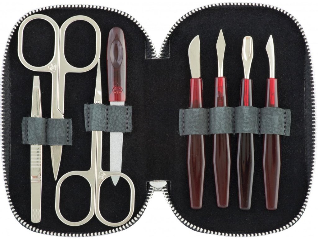 Středně velká manikúrní sada 8-dílná se uzavírá kvalitním zipem YKK, pouzdro je vyrobeno z šedé kůže se semišovým vzhledem a je naplněno manikúrními nástroji DUP. Rozměry: 12,5 x 8,5 x 2 cm.