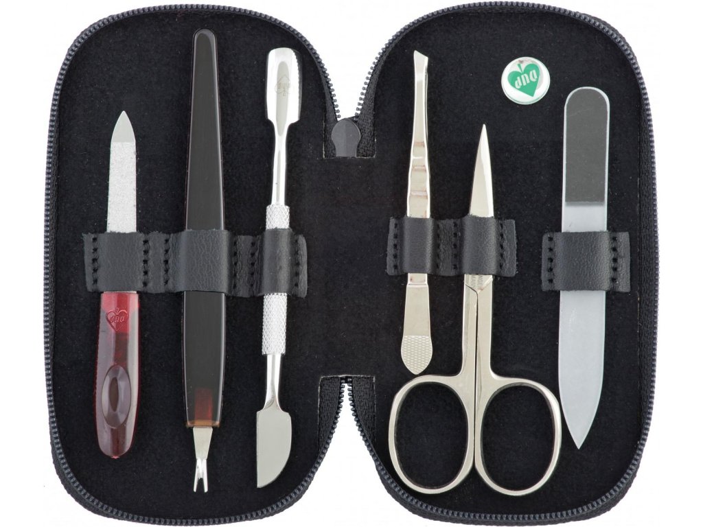 Manikúrní sada 6-dílná je vyrobena z modré koženky se vzorkem, koženými poutky, uzavírá se na zip a je naplněna manikúrními nástroji značky Solingen a DUP. Rozměry: 13 x 7 x 2 cm. Barva držátek se může měnit