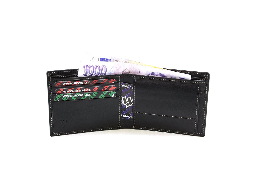 2 přihrádky na bankovky, kapsa na mince, 3 kapsy na kreditní karty, 2 skryté kapsy, dvojité prošití.