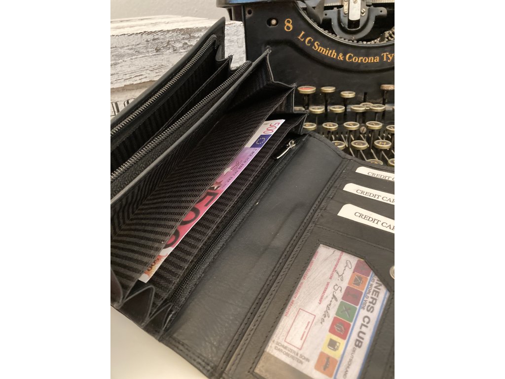 Uvnitř tři přihrádky na papírové bankovky a zipová kapsa na drobné mince. Na zadní straně přihrádka.